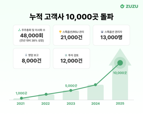 코드박스가 법인 운영 관리 올인원 솔루션 '주주(ZUZU)'의 누적 고객사 1만 곳을 돌파했다고 15일 밝혔다. 2017년 설립 이후 스톡옵션·주주명부 관리에서 시작해...