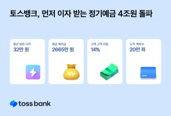 토스뱅크, 먼저 이자 받는 정기예금 4조원 돌파, 1인당 평균 이자 ‘32만원’