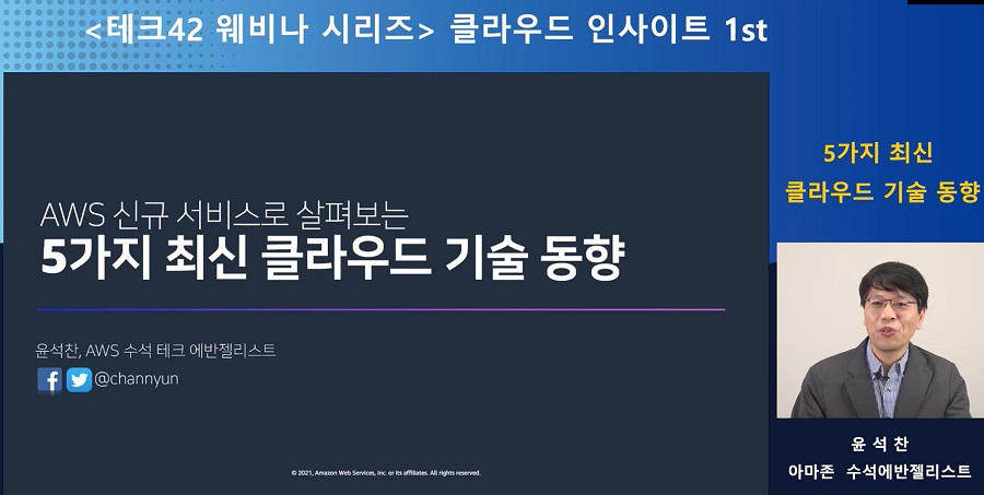 AI 기반 테크저널리즘 매체 테크42가 3일 개최한 웨비나 '클라우드 인사이트 1st'에 첫 강연자로 참석한 윤석찬 수석은 "AWS는 클라우드 시장을 선도하고 있는 회사다. 그만큼 수많은 고객을 확보하고 있어 이들에게 받는 피드백을 통해 신제품을 만들기에 시장이 원하는 기술 동향이 고스란히 담겨 있다"고 설명했다.