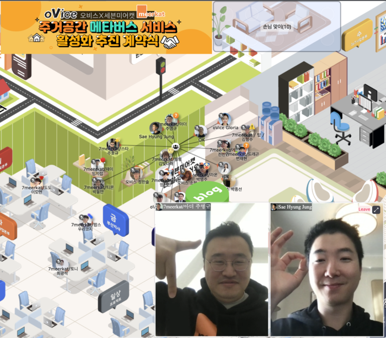 정세형 오비스 대표(오른쪽), 주명규 세븐미어캣 대표와 더불어 양사 임직원들은 세븐미어캣의 메타버스 오피스 공간에 모여 비대면으로 계약식에 참석했다. (사진=오비스) 비즈니스 메타버스...