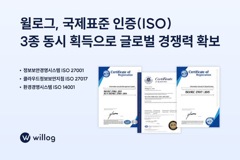 윌로그, 정보보호 및 환경경영시스템 국제표준 인증(ISO) 3종 동시 획득