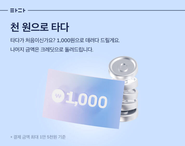 모빌리티 플랫폼 타다가 오늘 오후 4시부터 오는 27일까지 2주간 생애 첫 타다 탑승 고객을 대상으로 ‘천 원으로 타다’ 크레딧 캐시백...