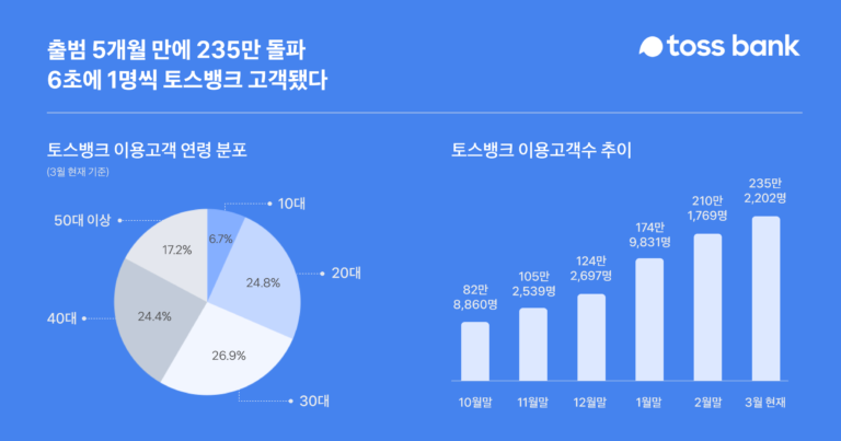 토스뱅크가 출범 5개월 만에 235만 고객을 넘어섰다. ‘연 2%’ 금리(세전) 혜택을 제공하는‘토스뱅크통장’의 가입 고객 수도 200만 명을 돌파했다. 출범 직후...
