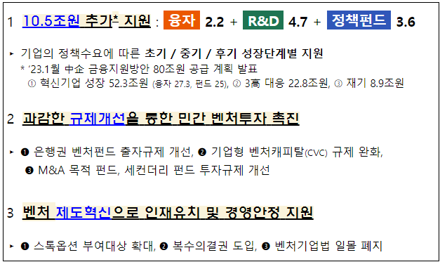 중소벤처기업부와 금융위원회는 20일 국무총리 주재 국정현안관계장관회의에서 경제위기 극복, 미래 성장동력 확보를 위한 '혁신 벤처‧스타트업 자금지원 및 경쟁력 강화 방안’을 발표했다. 이번 발표에는 기업의 성장 단계별 정책수요에 맞춰 10.5조원 추가 지원 관련 내용과 과감한 규제개선을 통한 민간 벤처투자 촉진, 벤처 제도혁신으로 인재유치 및 경영안정 지원으로 더욱 어려워진 경제여건 신속한 정부 대응과 안정적 미래성장동력 확보에 중점을 뒀다.