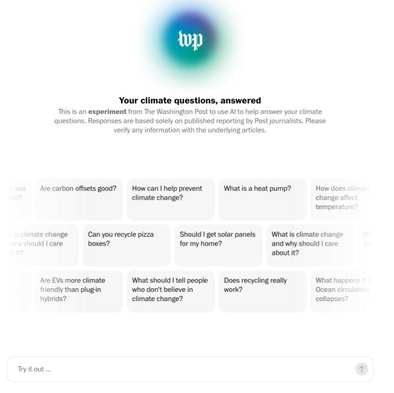 The Washington Post has launched an AI chatbot called 'Climate Answers' that responds to climate-related queries based on its articles.