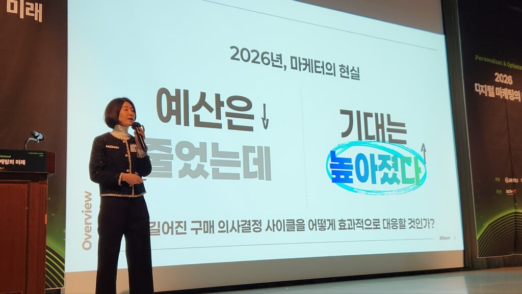 정민아 앨리슨하이퍼앰 대표는 이번 키노트에서 2026년 B2B 마케팅이 직면한 현실을 먼저 짚었다. 수년 전부터 이어진 경기 둔화는 구매 의사 결정 기간을 길게 만들었고, 예산은 줄어드는 반면 마케터가 처리해야 할 일은 계속 늘었다. 그는 “이 간극을 메울 수 있는 실질적인 도구는 AI”라고 말하며, 단순 자동화를 넘어 AI가 마케터의 업무 방식 전반을 바꾸고 있는 현실을 설명했다.