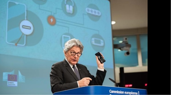 유럽의회는 2024년 말부터 모든 휴대폰에 C타입 USB(USB-C) 케이블 사용을 의무화했다. 티에리 브레톤 EC내수 담당 정책 집행위원이 10년 전부터 추진해 온 이 표준 정책을 강제화하는 법에 대해 설명하고 있다. (사진=EU)