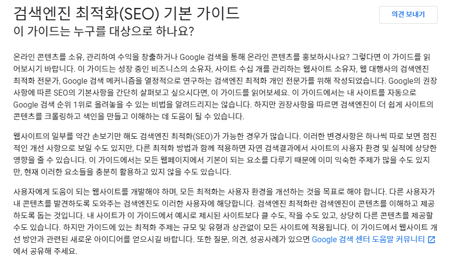 구글의 SEO 기본 가이드. 구글, 네이버 등의 주요 검색 엔진 및 서비스에서는 이와 같은 SEO 가이드를 제공하고 있다. (이미지=구글 사이트 캡처)