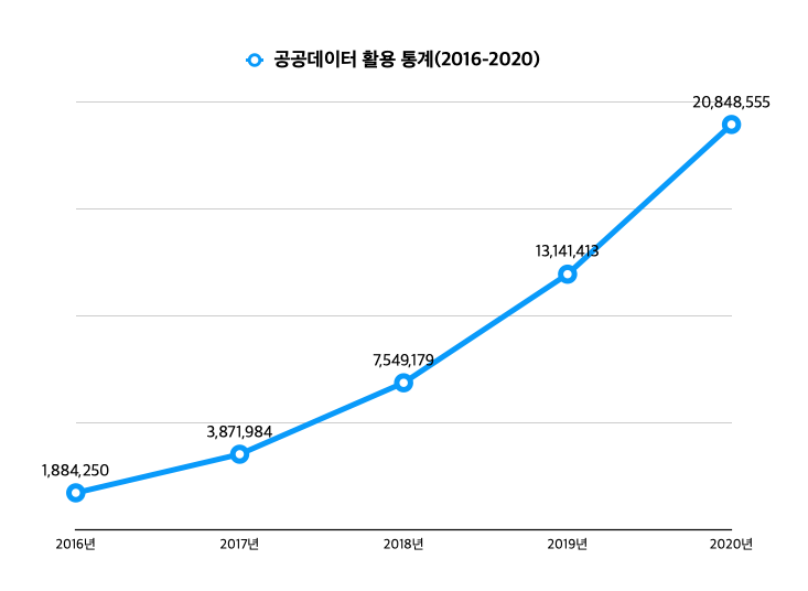 데이터가 세상에 나오자, 그 활용도는 급격하게 증가했다. 공공데이터포털에 따르면, 개방 초기인 2016년 약 188만건의 공공데이터 활용 건수는 5년 만에 2085만건으로 약 1100% 증가했다.