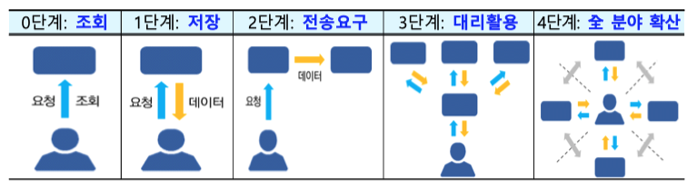 정부는 데이터 개방·활용 정도에 따라 마이데이터 사업 단계를 0 ~ 4단계로 구분하고 확산할 방침이다. 개인이 기기로 기관에 접속해서 정보를 열람하는 수준인 0단계부터, 개인의 정보가 자신의 관리 아래 전 분야에 걸쳐 활용될 4단계로 점점 데이터 활용성이 커질 예정이다.