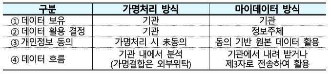 마이데이터가 주목 받게 된 계기는 지금까지의 개인정보가 포함된 데이터 활용 방식의 한계에서 비롯됐다. 개인정보를 활용하기 위해서는 가명처리를 해야한다. 가명처리된 개인정보는 '가명정보'가 되어 원래의 상태로 복원하기 위한 추가 정보의 사용 · 결합 없이는 특정 개인을 알아볼 수 없게 만들어진다.