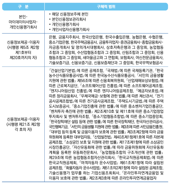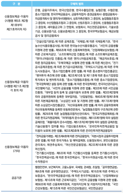 금융위원회는 "전송 요구에 의한 정보 전송은 개인이 자신의 정보 전송 의지를 사업자가 실행하도록 요구하는 것"이라고 설명했다. 금융분야 마이데이터 사업에서 각 주체의 범위는 다음과 같다. 아래와 같이 은행이나 금융지주회사는 정보제공자이자, 정보수신자가 될 수 있다.