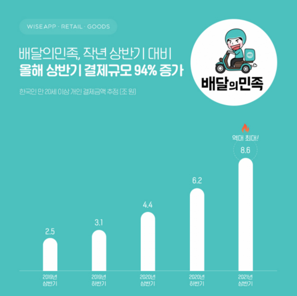 현재 배달 시장은 배달의민족(배민)이 이끌고 있습니다. 2021년 상반기 동안 배민을 통해 결제된 금액은 8조 6000억원을 넘어설 것으로 추정됩니다. 2020년 상반기 4조 4000억원 규모와 비교하면 약 94% 상승한 셈입니다. 모바일인덱스 조사 결과, 월간 활성 이용자 수(MAU) 역시 지난 2월 1728만명에서 7월 2074만명으로 20% 가량 올랐습니다.