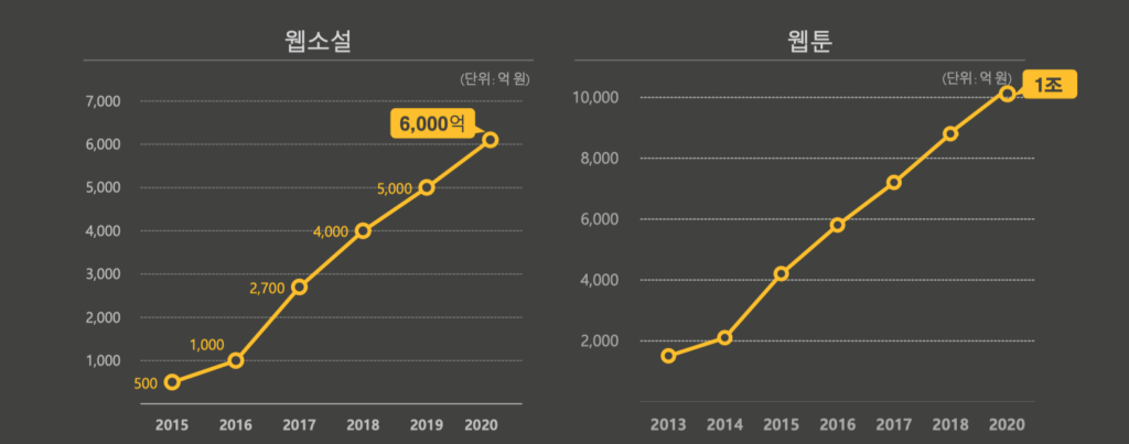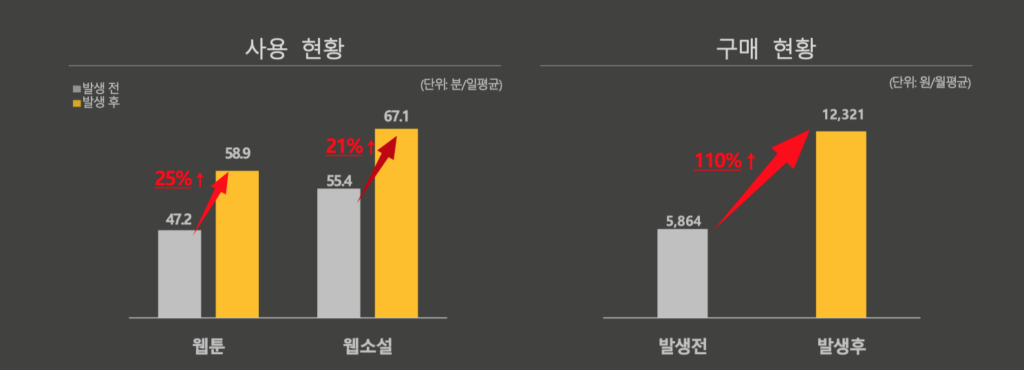 짧게는 1분, 길게는 5분. 하나의 웹툰 혹은 웹소설 콘텐츠를 소비하는데 걸리는 시간입니다. 동시에 콘텐츠 소비자로 하여금 자신의 가치관이나 취향과 맞는지 확인하는 시간이기도 합니다. 코로나 이후 '가불구취' 소비자는 하나의 양질의 콘텐츠를 오래 즐기기보다 자신이 즐길 수 있는 콘텐츠를 탐색하는 데 시간을 투자했습니다. 이는 자연스럽게 웹콘텐츠 소비량 증가를 불러왔고, 시장 확장을 가져옵니다. 코로나 팬데믹 이후 웹툰, 웹소설 사용량은 이전보다 일평균 23% 상승했으며, 구매 정도 역시 110% 올랐습니다. 콘텐츠 소비 시간 역시 2020년 7월 기준, 전년 동월 대비 24% 가까이 증가했습니다.