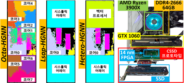 정명수 교수 연구팀이 개발한 홀리스틱 GNN 기술은 그래프 데이터 자체가 저장된 스토리지 근처에서 사용자 요청에 따른 추론의 모든 과정을 직접 가속한다. 구체적으로는 프로그래밍 가능한 반도체를 스토리지 근처에 배치한 새로운 계산형 스토리지(Computational SSD) 구조를 활용해 대규모 그래프 데이터의 이동을 제거하고 데이터 근처(Near Storage)에서 그래프 처리 및 그래프 샘플링 등을 가속해 그래프 기계학습 전처리 과정에서의 병목현상을 해결했다.