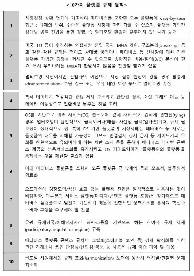 이에, 본 보고서는 플랫폼 규제 논의를 정리하고 10가지 플랫폼 규제 원칙을 제시했다.