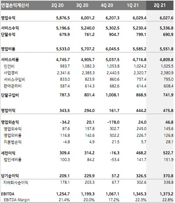 2분기 무선 매출은 전년 동기 대비 3.8% 증가한 1조7885억원을 기록했다. 무선 서비스 매출은 전년동기대비 4.5% 성장했다. 2분기 말 기준 5G 누적 가입자는 501만명으로, 후불 휴대폰 가입자 중 35% 비중을 차지한다. 2분기 가입자당평균매출(ARPU)은 전년동기대비 3.0% 증가한 3만2342원이다.
