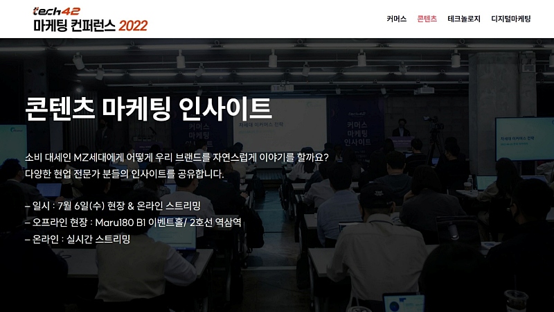 AI 기반 테크저널리즘 미디어 테크42가 주최하는 '콘텐츠 마케팅 인사이트 2022' 컨퍼런스가 오는 7월 6일 서울 역삼동 마루180에서 개최한다.