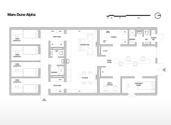 화성 모의 거주지는 거주구역, 작업실, 의료시설 및 식품재배시설로 구성된다.