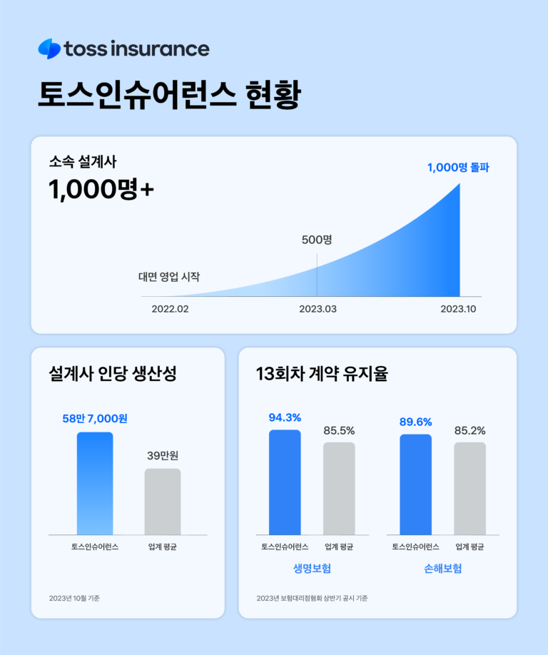 비바리퍼블리카(이하 토스)의 법인보험대리점(GA) 자회사 토스인슈어런스는 소속 설계사 1000명(10월 말 기준)을 돌파했다고 23일 밝혔다. 이는 지난해 2월 대면 영업으로 전환 후...