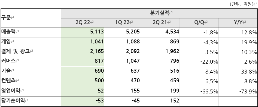 NHN이 올 2분기 실적을 9일 발표했다. NHN의 연결기준 2022년 2분기 매출은 전년 동기 대비 12.8% 상승, 전 분기 대비로는 1.8% 감소한 5113억원, 영업이익은 52억원을 기록했다.