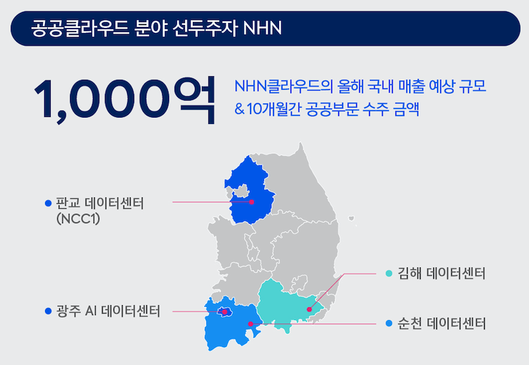 NHN 클라우드는 올해 공공 부문에서만 1,000억 원을 수주하고 매년 30% 이상의 매출 성장을 이어가고 있다. 특히, 국가 인공지능 데이터센터 사업과 지역 거점의 공공 클라우드 전환 사업 등의 성과가 두드러졌다. NHN 클라우드는 공공 부문에서 행정안전부, 중소기업벤처부, 교육부, 광주광역시청, 전남도청 등을 고객사로 두고 있다.