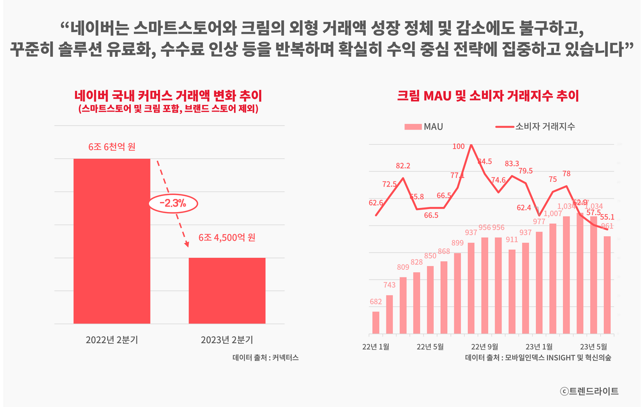 네이버의 2023년 2분기 실적이 공개되었습니다. 매출과 영업이익 모두 분기 역대 최대 실적을 기록하였는데요. 커머스와 콘텐츠 매출이 40%대의 높은 성장률로 실적을 견인했다고 합니다. 하지만 마냥 긍정적인 면모만 있는 건 아닙니다. 커머스, 그것도 국내 실적만 따로 떼서 보면, 위기라고 해도 어색하지 않을 정도로 위험한 신호가 감지되고 있기 때문입니다.