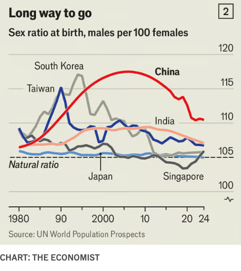 별 선이 자연적인 성비 기준선인 105보다 높다면 상당한 남초 상황임을 의미합니다. 각 아시아 국가의 출생성비를 색상별로 구분했는데요. 짙은 빨간색은 중국, 옅은 회색은 대한민국, 짙은 남색은 대만 등으로 나타내고 있습니다.