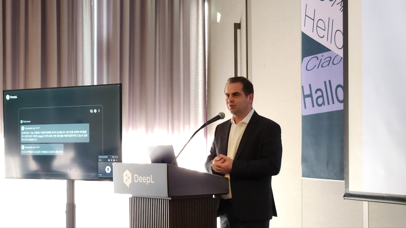2일 테크42와 마주한 쿠틸로브스키 CEO는 실시간 음성 번역 솔루션 ‘딥엘 보이스(DeepL Voice)’의 라이브 시연과 함께 에이전트형 AI 솔루션 DeepL Agent, 기업 맞춤형 언어 관리 플랫폼 커스터마이제이션 허브의 실제 사례 등을 설명했다. 그 외에도 쿠틸로브스키 CEO는 딥엘 보이스의 음성 간 통역 기능 업데이트를 언급하기도 했다.