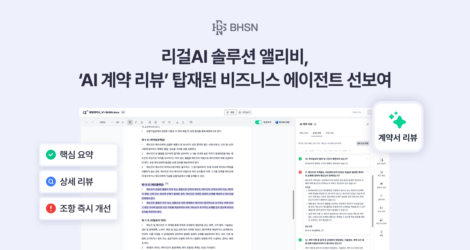 리걸AI 솔루션 ‘앨리비’를 운영하는 BHSN(비에이치에스엔)은 국내 최초 ‘AI 계약 리뷰(AI Contract Review)’ 기능을 상용화한 ‘비즈니스 에이전트’를 새롭게 선보인다고 26일 밝혔다....