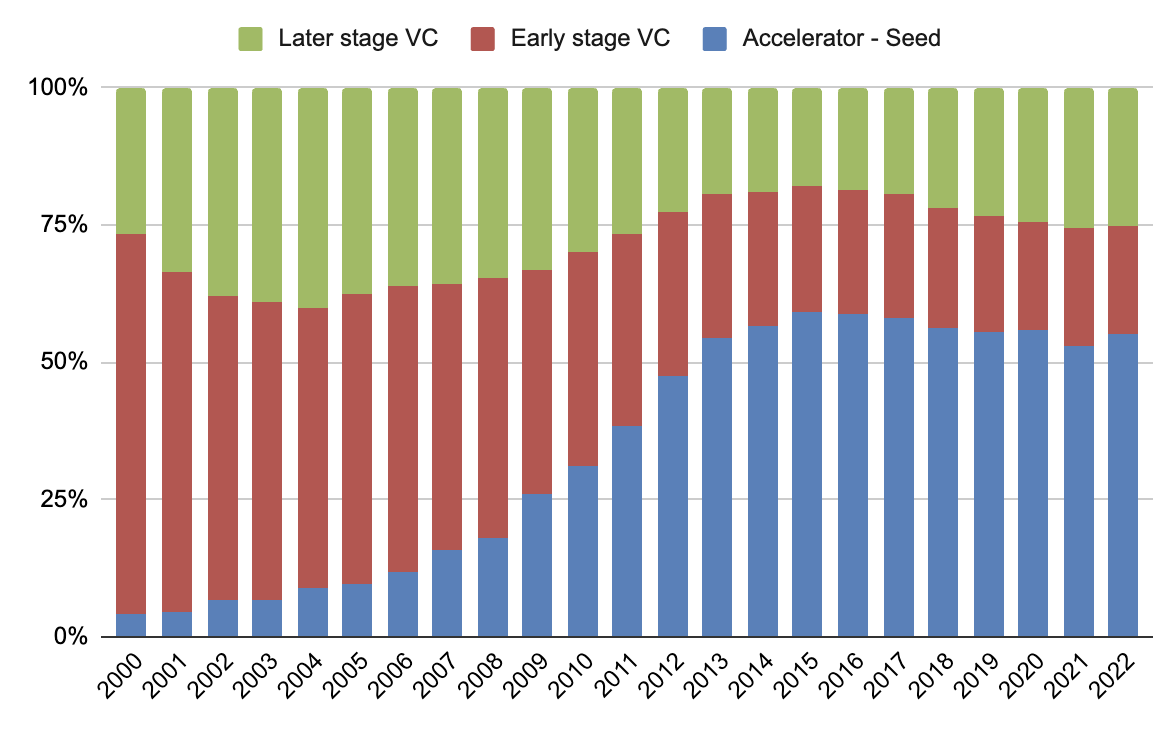 지난 20년간 벤처캐피털/스타트업 생태계는 크게 성장해 왔습니다. 생태계의 크기를 고려할 때 VC의 투자 건수는 중요한 지표가 되는데요, 아래 차트에서 나타내고 있는 것과 같이 투자 건수는 큰 폭으로 증가했습니다. 더 많은 투자자들이 더 많은 스타트업 투자딜에 투자를 해 오고 있는 것입니다.