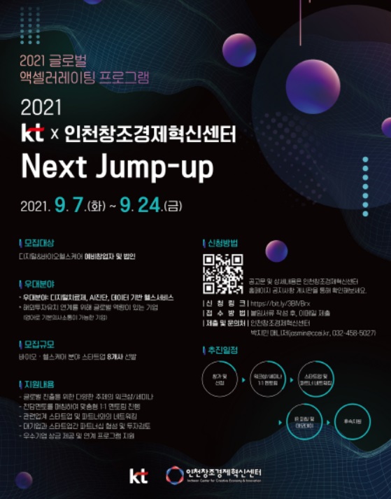 KT는 인천창조경제혁신센터와 공동으로 디지털&바이오헬스케어 분야의 ‘차세대 유니콘’이 될 유망 스타트업을 발굴, 육성하는 전문 엑셀러레이팅 프로그램 ‘넥스트 점프업(Next Jump-up)’을 시행한다고 10일...