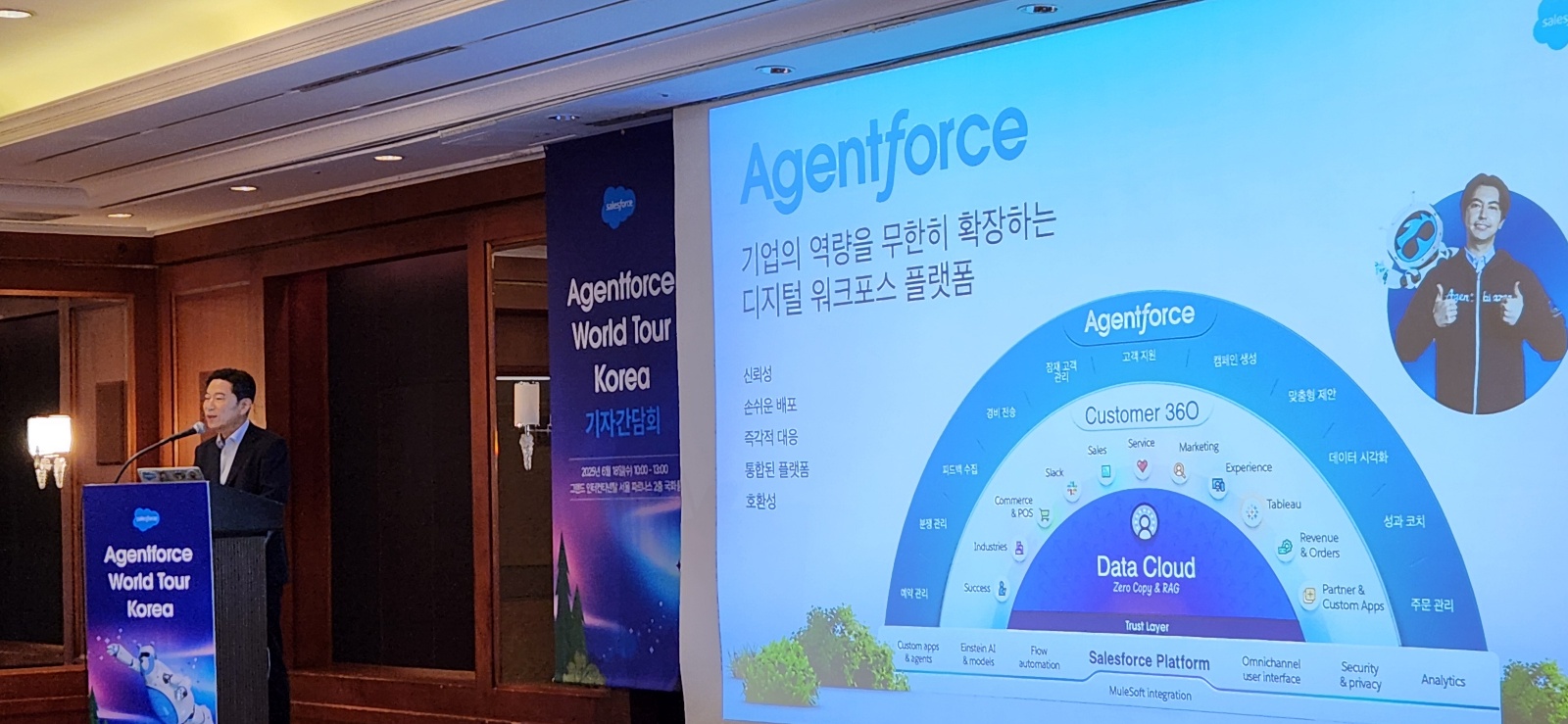 손부한 세일즈포스 코리아 대표는 “단순한 AI 활용을 넘어, 자율적인 AI 에이전트가 인간과 협력해 업무를 혁신하는 시대에 접어들었다”며 AI 에이전트 시대의 비즈니스 패러다임 변화를 언급했다. 이어 손 대표는 AI 주권 및 데이터 역외 유출 방지의 중요성을 언급하며 “올해 3분기 중 한국 고객을 위해 한국 데이터센터 기반의 데이터 클라우드 에이전트포스 플랫폼 서비스를 시작할 예정”이라며, 그에 대한 전략적 투자를 발표하기도 했다.