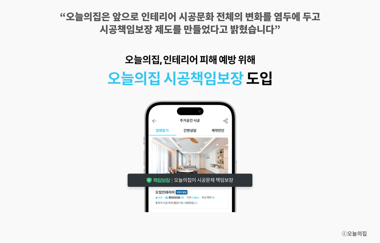 오늘의집은 여기서 물러서지 않았습니다. 오늘의집은 지난 6월 인테리어 시공 중개업체 최초로 시공책임보장 제도를 도입하면서, 전면적인 구조 개선에 나섰습니다. 일단 무면허 업체가 난립하는 것을 막고자, 일종의 인증제를 도입하여, 조건에 부합하는 업체들에게 '책임보장' 뱃지를 부여했고요. 분쟁 발생 시 대신 책임지고 해결한다는 것을 명문화하고, 보상제도도 마련했습니다.