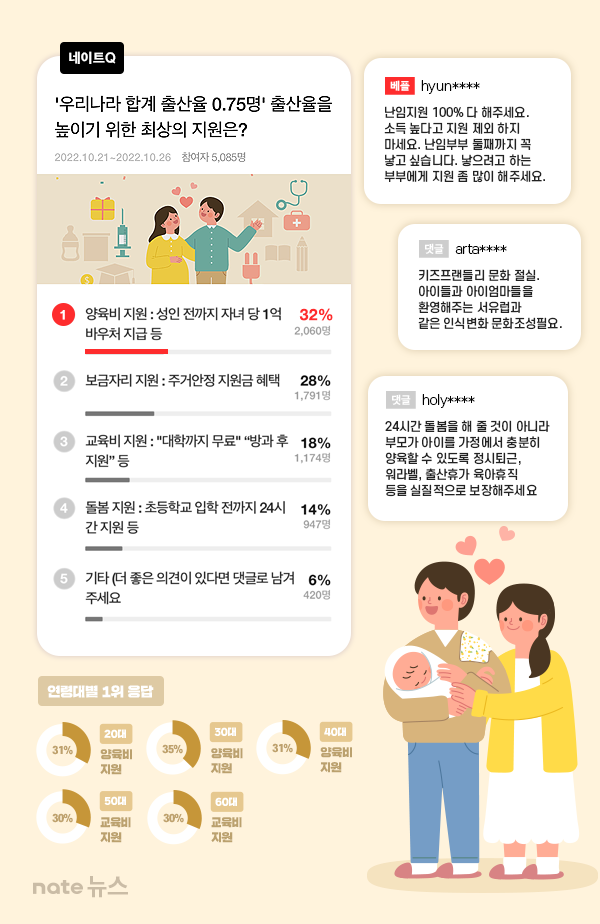 최근 성인남녀 6392명을 대상으로 ‘출산율을 높이기 위한 최상의 지원정책’을 묻는 설문조사를 실시한 결과, 응답자 중 32%(2,060명)가 ‘성인 전까지 자녀 당 1억원 바우처 지급’ 등과 같은 현실적 수준의 양육비 지원이 가장 필요하다고 답했다.