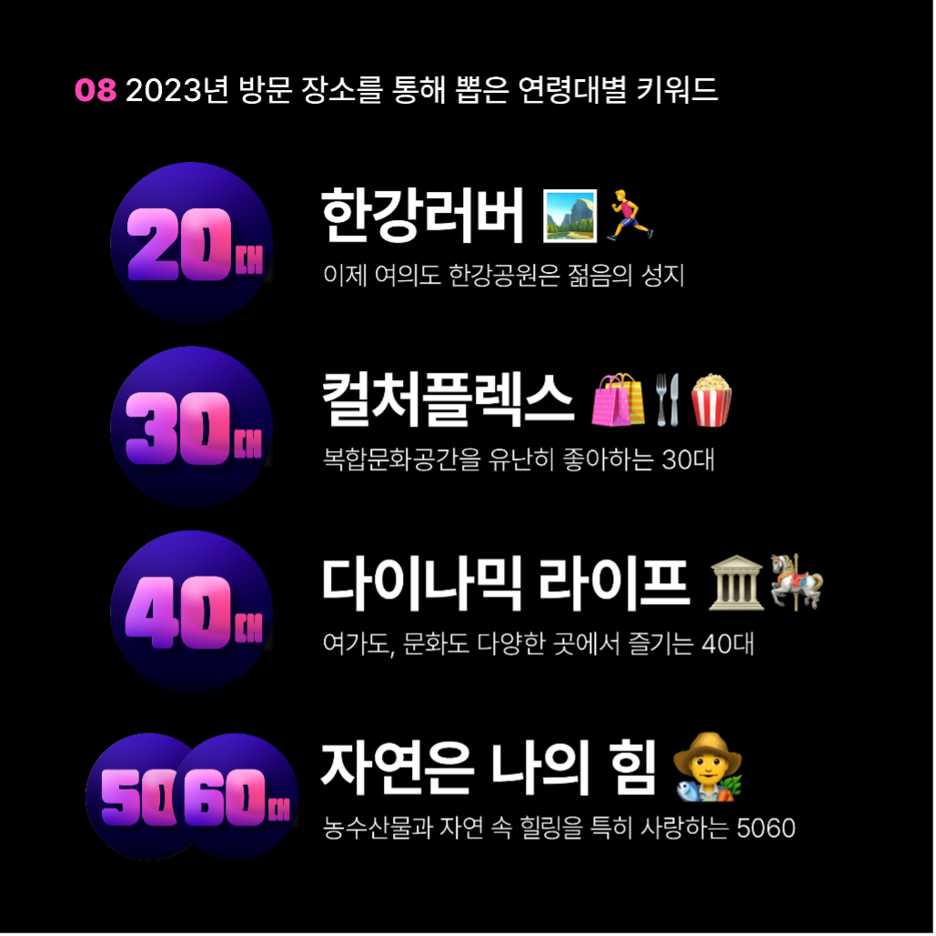 2023년 한 해 20대가 차량을 이용해 가장 많이 간 곳은 강과 바다였다. 30대는 복합문화공간, 50~60대는 농수산물시장과 자연 속 힐링 장소를...
