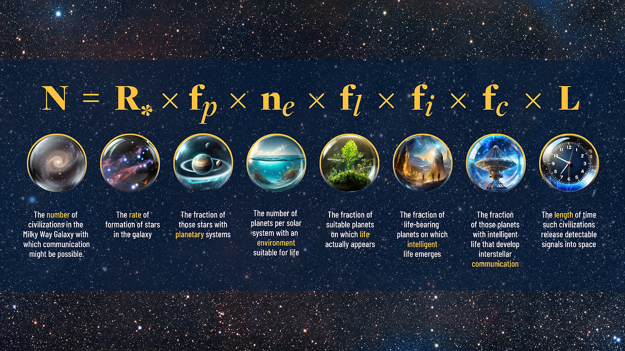 과거 프랭크 드레이크(Frank Drake)라는 천문학자가 있었다고 합니다. 우리 은하에서 인간과 교신할 수 있는 외계 문명의 존재 가능성을 확률적 접근 방법으로 어떤 방정식 하나를 그가 고안해 냈다고 하죠. 그리고 이를 드레이크 방정식(Drake equation)이라고 부릅니다. 방정식은 아래와 같습니다.