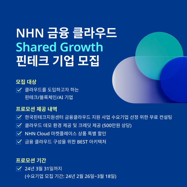 엔에이치엔 클라우드(이하 NHN클라우드)는 ‘2024년 금융 클라우드 지원 사업’에 공급 기업으로 4년 연속 참여하고 다양한 혜택을 제공하는 프로모션을 진행한다고 7일 밝혔다....