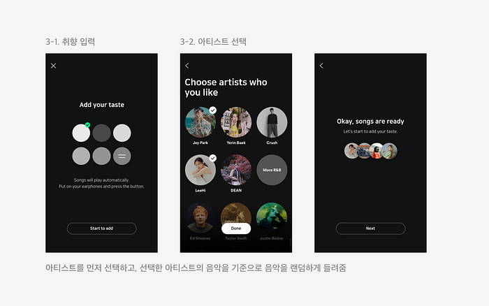 ‘Start to add’ 버튼을 누르면 내가 선호하는, 또는 원하는 아티스트를 선택할 수 있는 화면이 노출됩니다. 선택한 아티스트를 기준으로 랜덤한 음악이 자동 재생됩니다.