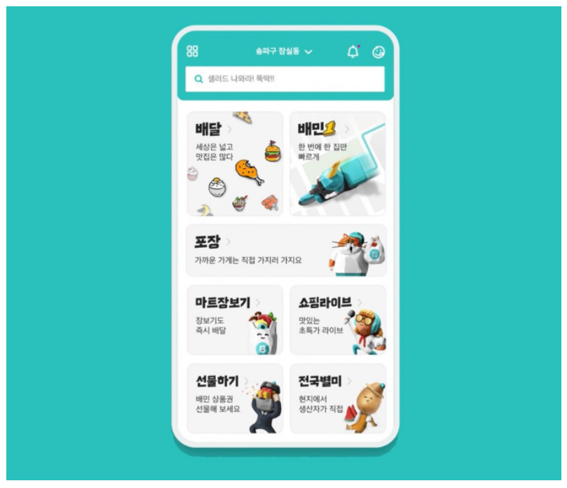 그리고 이러한 비전에 걸맞게 많은 서비스들이 배민에 추가됩니다. 모바일로 미리 주문하는 배민오더부터, 퀵커머스 B마트, 선물하기, 전국별미, 배민 라이브까지 말입니다. 그리고 드디어 이번 리뉴얼에 이르러 배민은 푸드 슈퍼앱으로써의 정체성을 명확하게 드러냅니다. 총 7가지 영역으로 구성된 첫 화면에서 무려 4개가 배달과 상관없는 메뉴이니 말입니다. 이제 배민은 노골적으로 푸드 슈퍼앱을 지향하고 있습니다.