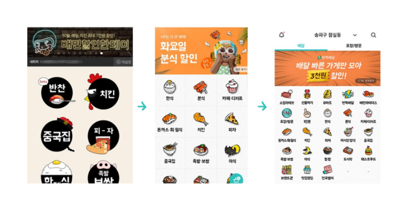 배민의 UX는 철저하게 목적에 따라 원하는 메뉴로 이동할 수 있도록 설계되어 있습니다. 아예 처음 대문부터 자신이 원하는 영역을 골라 들어갈 수 있게 했다는 점이 특이점입니다. 배달을 할 사람은 배달만, 마트를 이용할 사람은 마트만 이용하도록 고객 이동 경로를 설계한 겁니다.