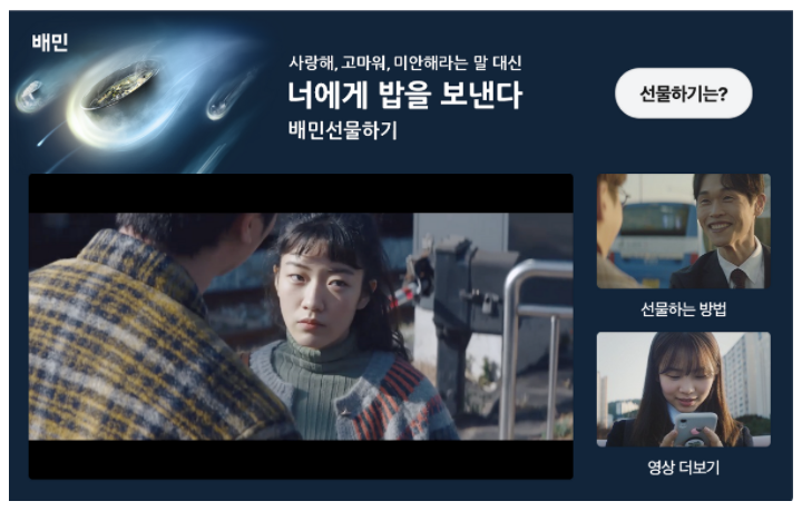 먼저 배민은 독특합니다. 유니크함이 아주 매력 포인트입니다. 배민이 가진 기업 브랜드 자체에서도 키치함이 잘 묻어 있는데요. 그래서인지 광고에서도 카피, 구성, 스토리 모두 기존에 우리가 알던 내러티브를 비트는 방식을 많이 차용합니다. 가장 최근 진행했던 배민 선물하기 광고 캠페인도, 스타는 없지만, 연기파 배우들을 섭외하여 웹드라마와 같은 퀄리티를 보여주었고요. 여기에 환상적인 비주얼을 담아, 정말 인상적인 광고를 선보였습니다. 광고 영상임에도 불구하고 유튜브 조회 수 3천만 회를 넘겼을 정도입니다.