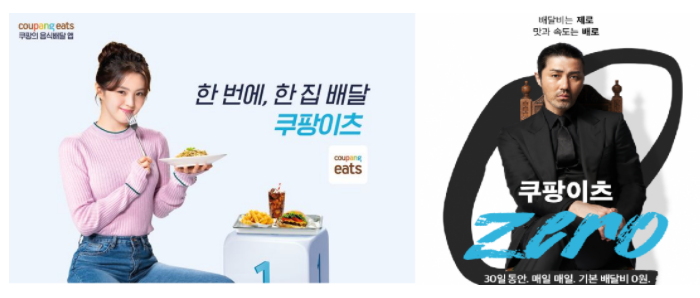 그렇다면 둘의 홍보전략은 어떠할까요? 우선 배민과 쿠팡이츠 모두 대형 캠페인을 겁내지 않는다는 것이 공통점입니다. TV광고도 자주 진행하고요. 버스 광고 같은 옥외 광고들도 대대적으로 선보입니다. 물량 면에서도 둘은 라이벌답게 치열하게 경쟁합니다. 하지만 대형 캠페인을 풀어나가는 방식 자체는 결이 매우 다릅니다