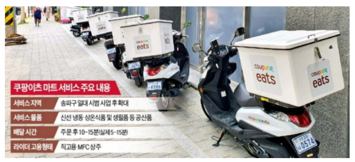 하지만 가만히 있을 쿠팡이츠가 아니겠지요? 쿠팡이츠가 2021년 7월 초부터 송파구에서 마트 서비스를 시범적으로 운영하기 시작한 겁니다. 순수한 배달 앱으로 운영되던 쿠팡이츠 앱에도 커머스 기능이 붙은 건데요. 단건 배달로 압도적인 속도로 승부를 걸었듯이, 이번에도 15분 내 배달이라는 필살기를 앞세웠다고 합니다. B마트가 자리 잡아가던 배민에게는 청천벽력과 같은 소식이 아닐 수가 없겠지요. 둘의 대결은 전방위로 번져나가고 있습니다.