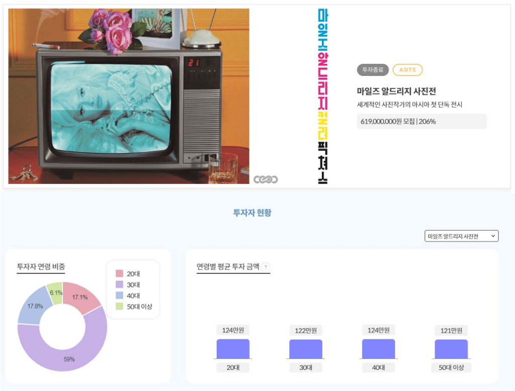 펀더풀이 지난 3월 말 진행했던 전시 <마일즈 알드리지 사진전> 프로젝트의 경우, 투자 모집 시작 약 6분만에 목표 모집액을 초과 달성했는데, 투자자의 약 76%가 MZ세대였다. 그중 Z세대는 약 17%로 평균 투자금액이 인당 124만원으로 매우 높게 나타났다.